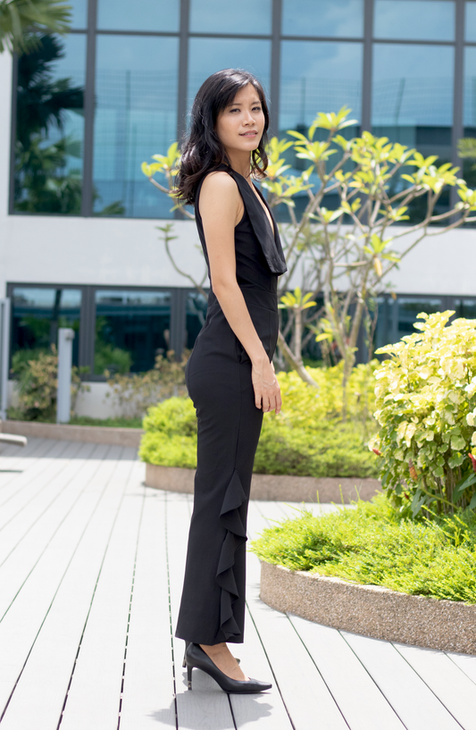 Black V Neck Foldover Tiered Ruffle Jumpsuit